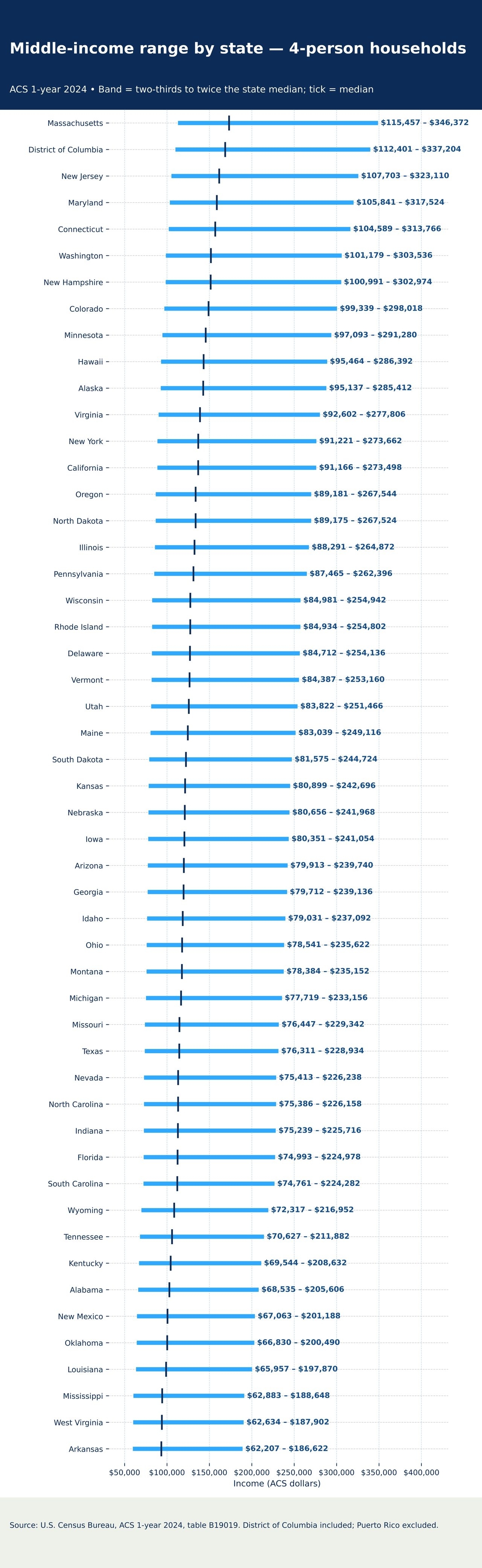 Using 2024 ACS one-year data, the analysis sizes middle income as two-thirds to twice each state’s median by household size. For four-person households, medians range from about $93,000 to $173,000; for one-person households, from roughly $30,000 to more than $78,000. These bands reflect income distributions, not prices, so purchasing power will differ once local costs are considered (for example, via BEA’s regional price parities).