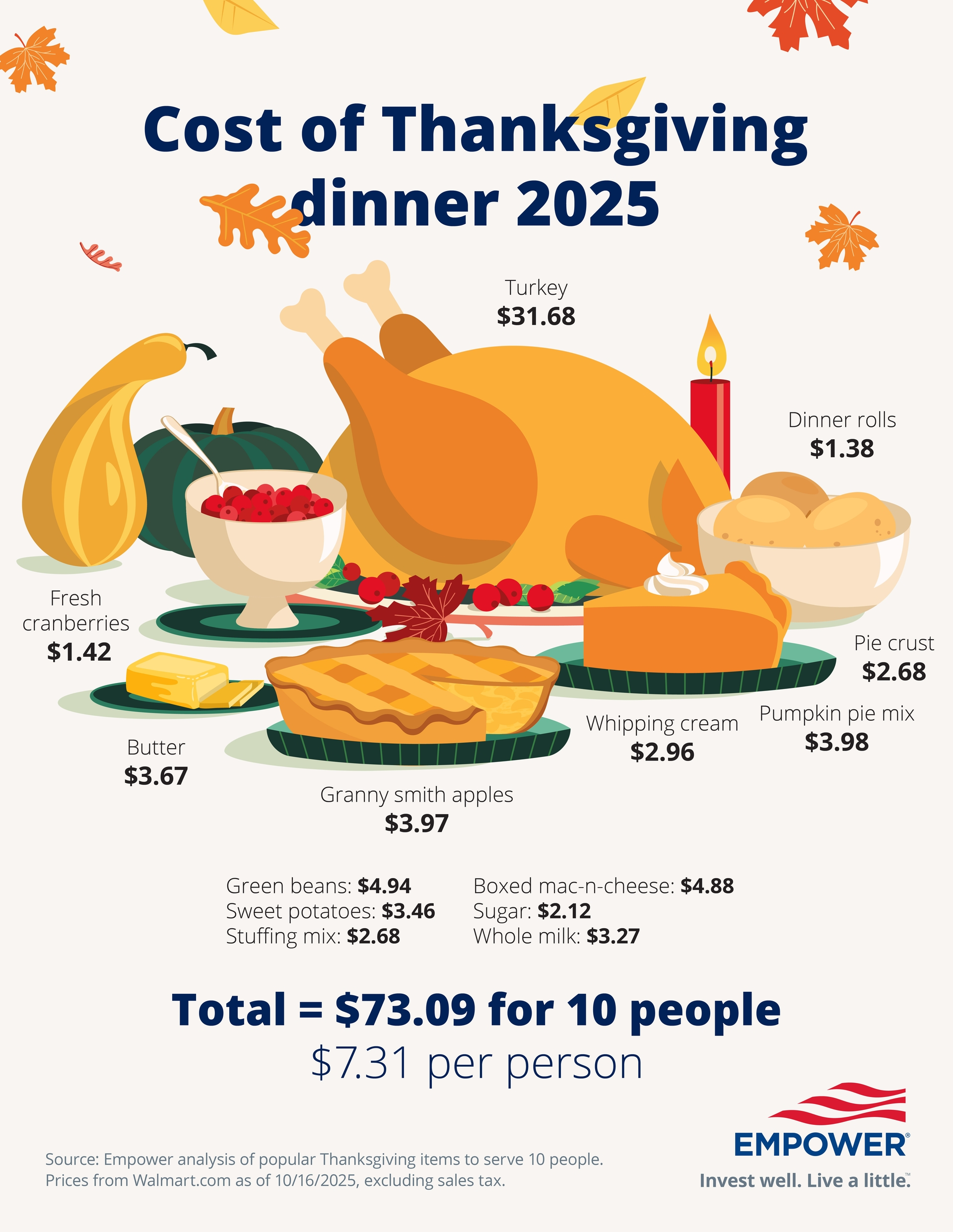 Empower’s analysis shows the price of a traditional Thanksgiving spread for 10 people totals $73.09, though the final bill depends on where you shop, what you serve, and how many guests are at the table.