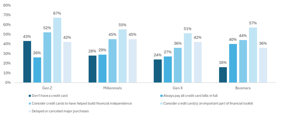 Questions: Which, if any, of the following statements describe your current credit card situation? Please select all that apply - "I don't have a credit card" and "I always pay all my credit card bills in full to avoid interest"; To what extent, if at all, do you agree or disagree with each of the following statements? Please select one option for each row - "Credit cards have helped me build financial independence" and "I consider my credit card(s) an important part of my financial toolkit"; and Which, if any, of the following actions have you taken in response to financial strain or credit card debt? Please select all that apply - "Delayed or canceled major purchases". Source: Empower “Credit Card Debt Survey”, July 2025.