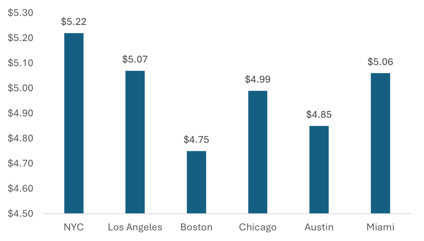 How much it costs to simply get to work varies dramatically (figure 3). Commuting expenses show sharp contrasts across major metro areas, with NYC topping the list at $41.65/day, far exceeding other cities due to high transit and rideshare dependence.6 Miami ($17.50/day) and Austin ($24.50/day) are the most affordable, despite being car-dependent, likely due to lower parking fees and shorter travel distances.7 Boston and Chicago, while transit-heavy, still cost over $30/day, proving that even public transportation isn’t always cheap.8